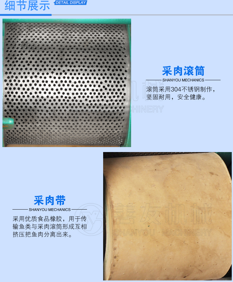 本机装有采肉桶和压榨肉用的橡胶带,利用滚动的采肉桶和传动的橡胶带的相互压榨运动将鱼挤入采肉桶内,而把鱼皮、鱼骨留在采肉桶外,由刮刀把它送出机外。
