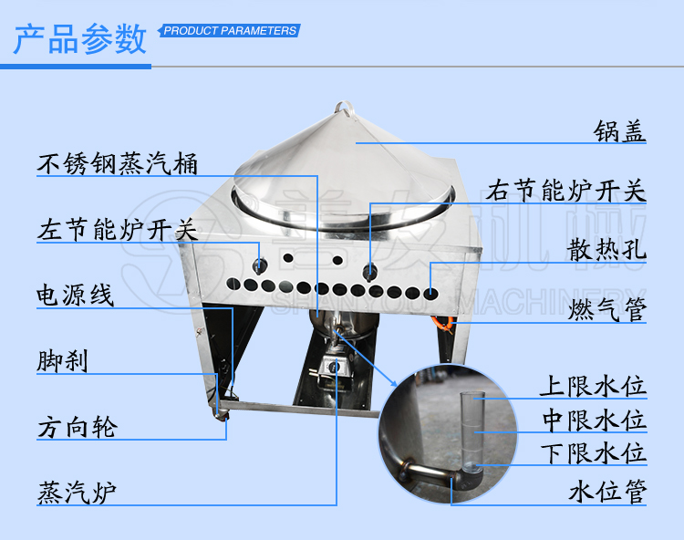 2、采用专业不锈钢无压力蒸汽锅,可以观察锅内水量多少,不会缺水干烧,加水方便、产汽快、干净卫生。