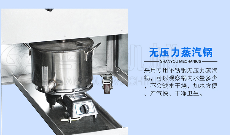 2、采用专业不锈钢无压力蒸汽锅,可以观察锅内水量多少,不会缺水干烧,加水方便、产汽快、干净卫生。